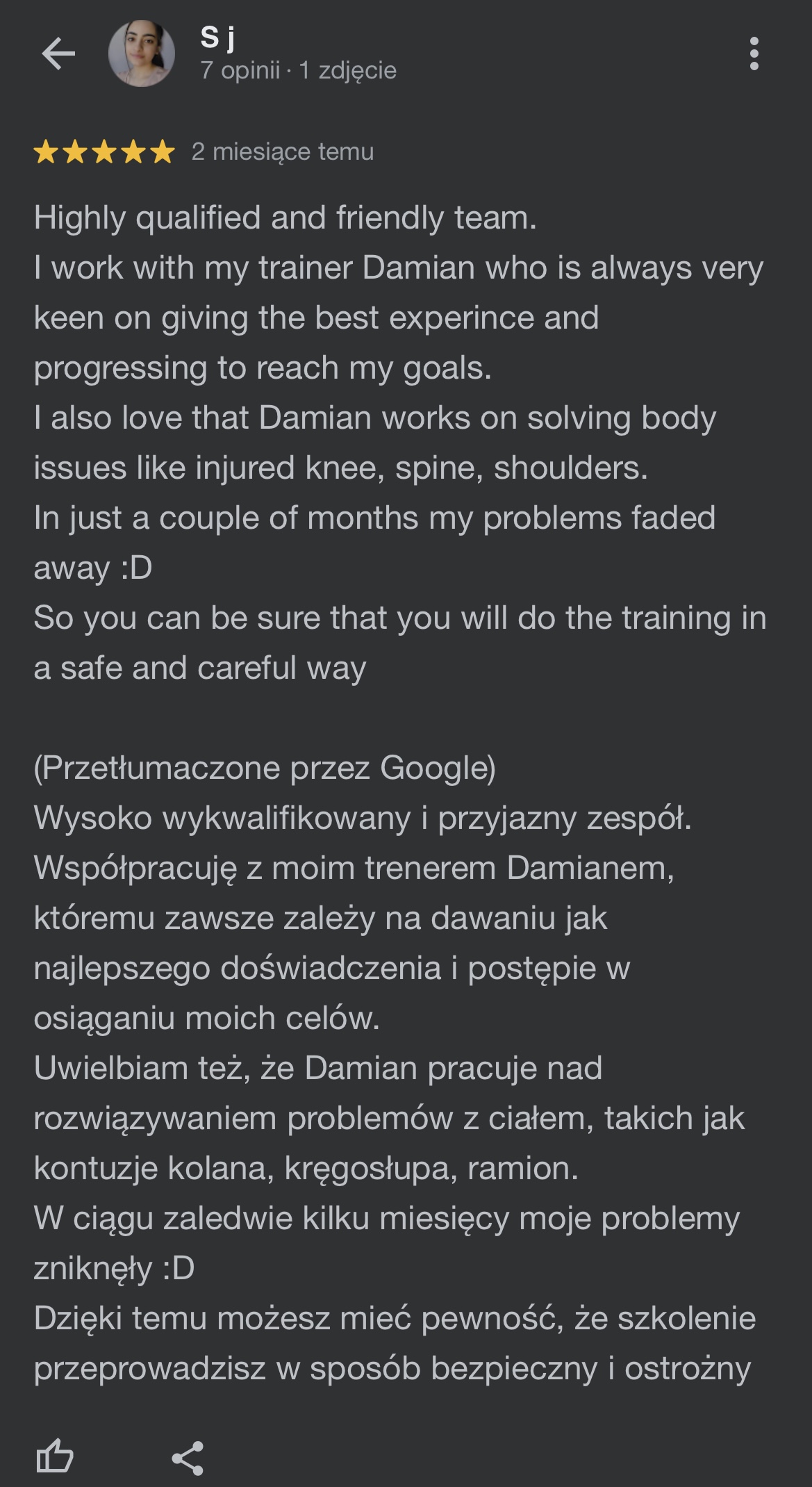 „Jeśli szukasz kogoś kto pokaże Ci jak poruszać się bez bólu, wrócić do aktywności po kontuzji czy może chcesz rozpocząć przygodę ze sportami siłowymi, to koniecznie zgłoś się do mnie! Jestem certyfikowanym trenerem medycznym i z chęcią przygotuję dla Ciebie spersonalizowany plan działania oparty o najnowszą wiedzę”.